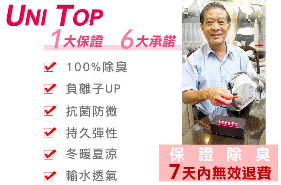 因此,杨何源不断向专业人士讨教,最后运用竹炭母粒奈米分散技术、融入聚丙烯纤维,开发出专利的「黑晶竹炭纤维」。他说,经过近千度高温炭化的黑晶竹炭纤维,具有远红外线、负离子,添加竹炭纤维的「Uni top」内衣裤、袜子、运动背心等产品,经过认证可有效防霉、除臭、抑菌。