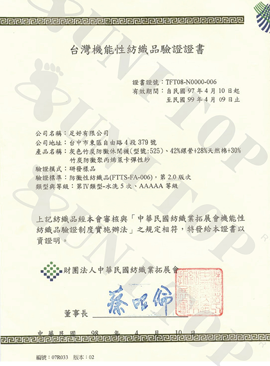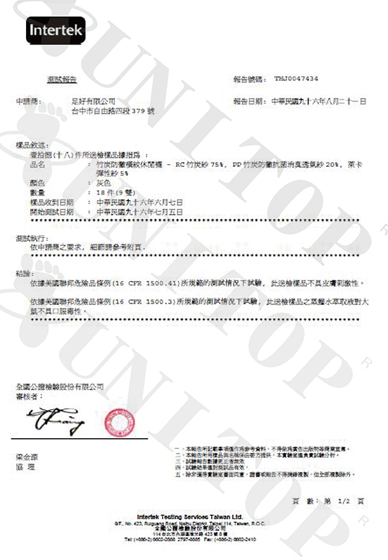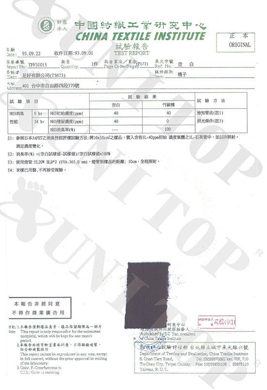 A1:足好 UNI-TOP 积极研发 【独家专利黑晶竹炭纱线】,使用成本偏高的聚丙烯环保纱线,从竹炭纺纱即是原料制成,与坊间染色,泡水,使用化学药剂制成之竹炭商品完全不同,所以具有 100% 除臭效果。