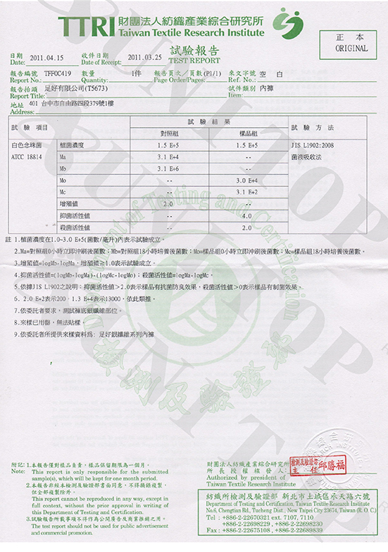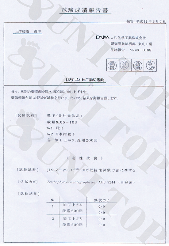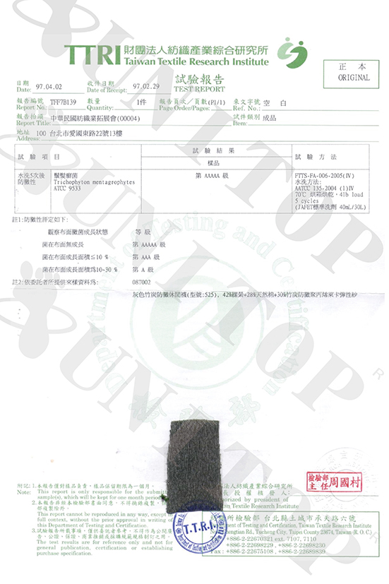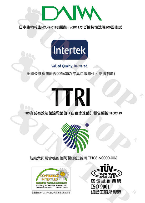 足好 UNI-TOP 黑晶竹炭产品,细菌难以滋生,进而达到抗菌消臭的效果。因为抗菌消臭是PP纱本身的物性,所以足好 UNI-TOP 黑晶竹炭产品的抗菌除臭功效不会因为水洗时间或是穿着而降低。