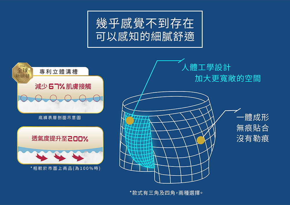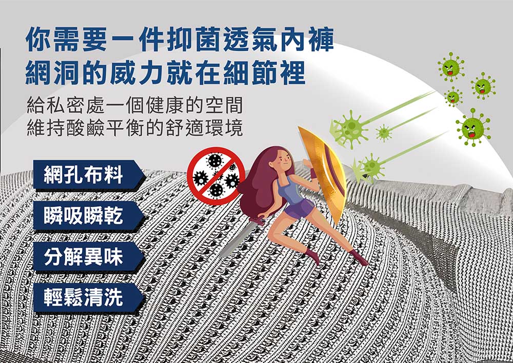 ■ 獨家專利褲底網洞立體溝槽編織,減少67%接觸面積 真正達到透氣.乾爽.不濕黏.無異味.零感染的舒適感