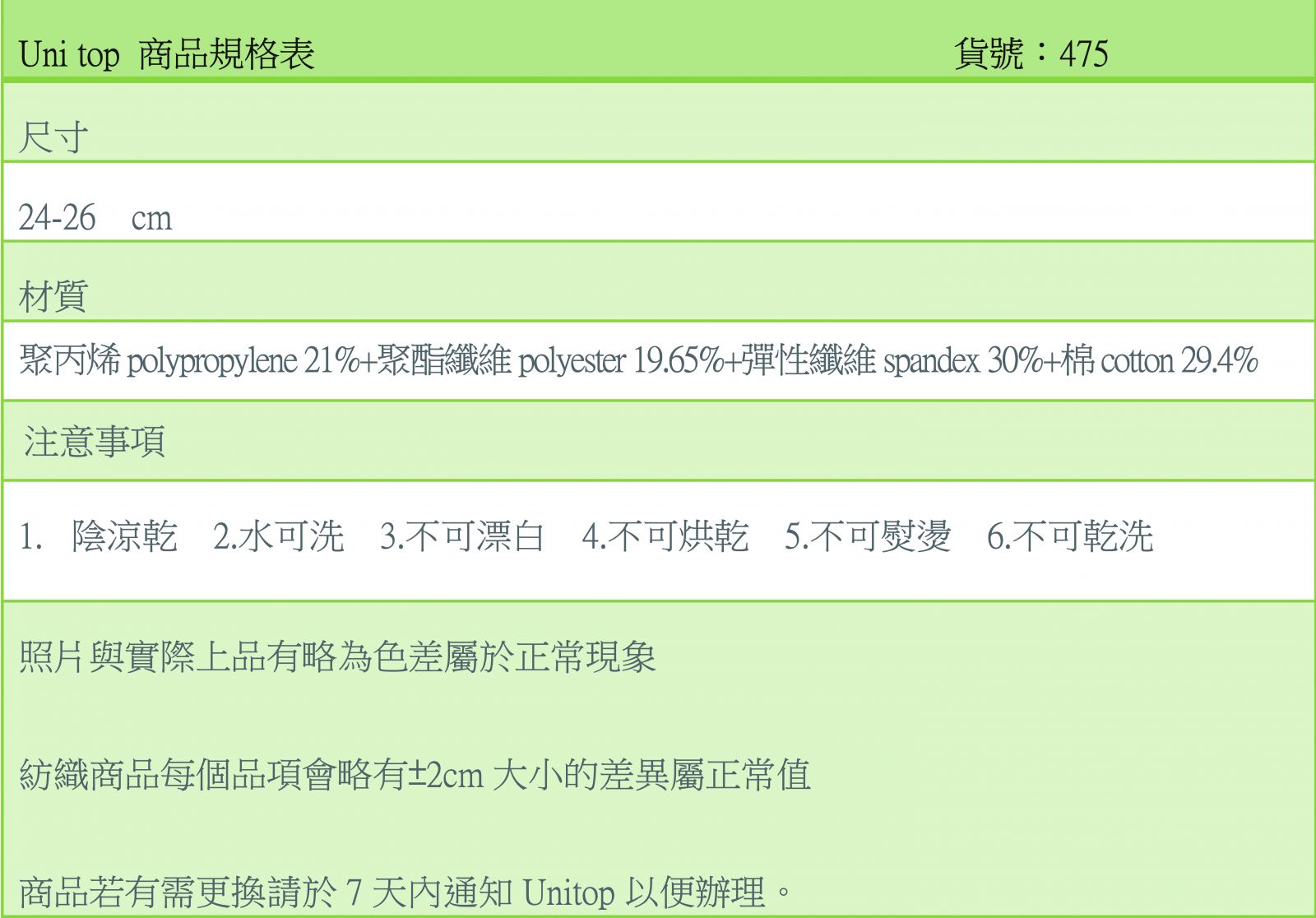 本產品保證不含殺菌藥水及螢光漂白,見證期間請勿與其它商品交替穿著。